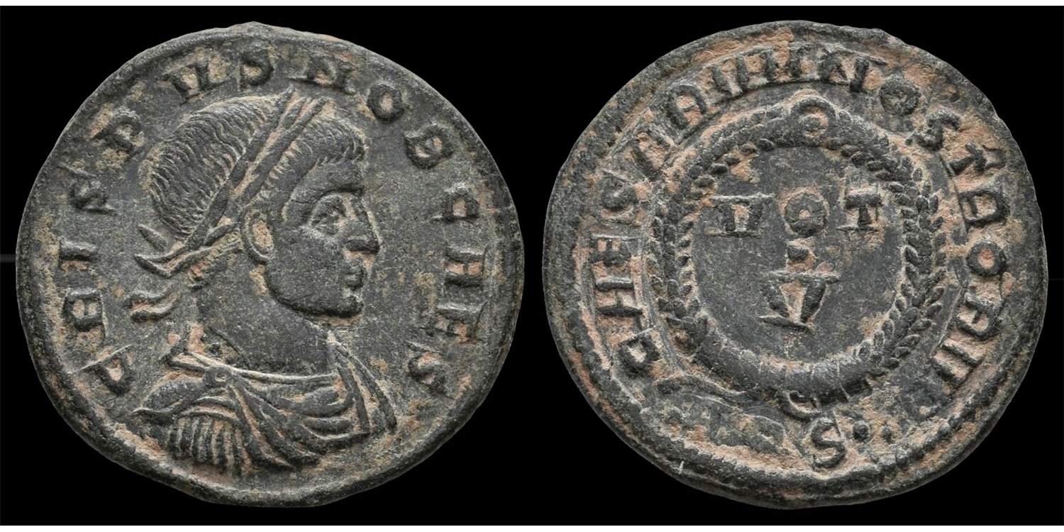 AE 2,19 gm. CRISPVS NOB CAES. Busto laureado, drapeado y acorazado, visto de frente a la derecha / CAESARVM NOSTRORVM - VOT X, flanqueado por palmas dentro de una corona de laurel; AQS en el exergo. RIC 108.