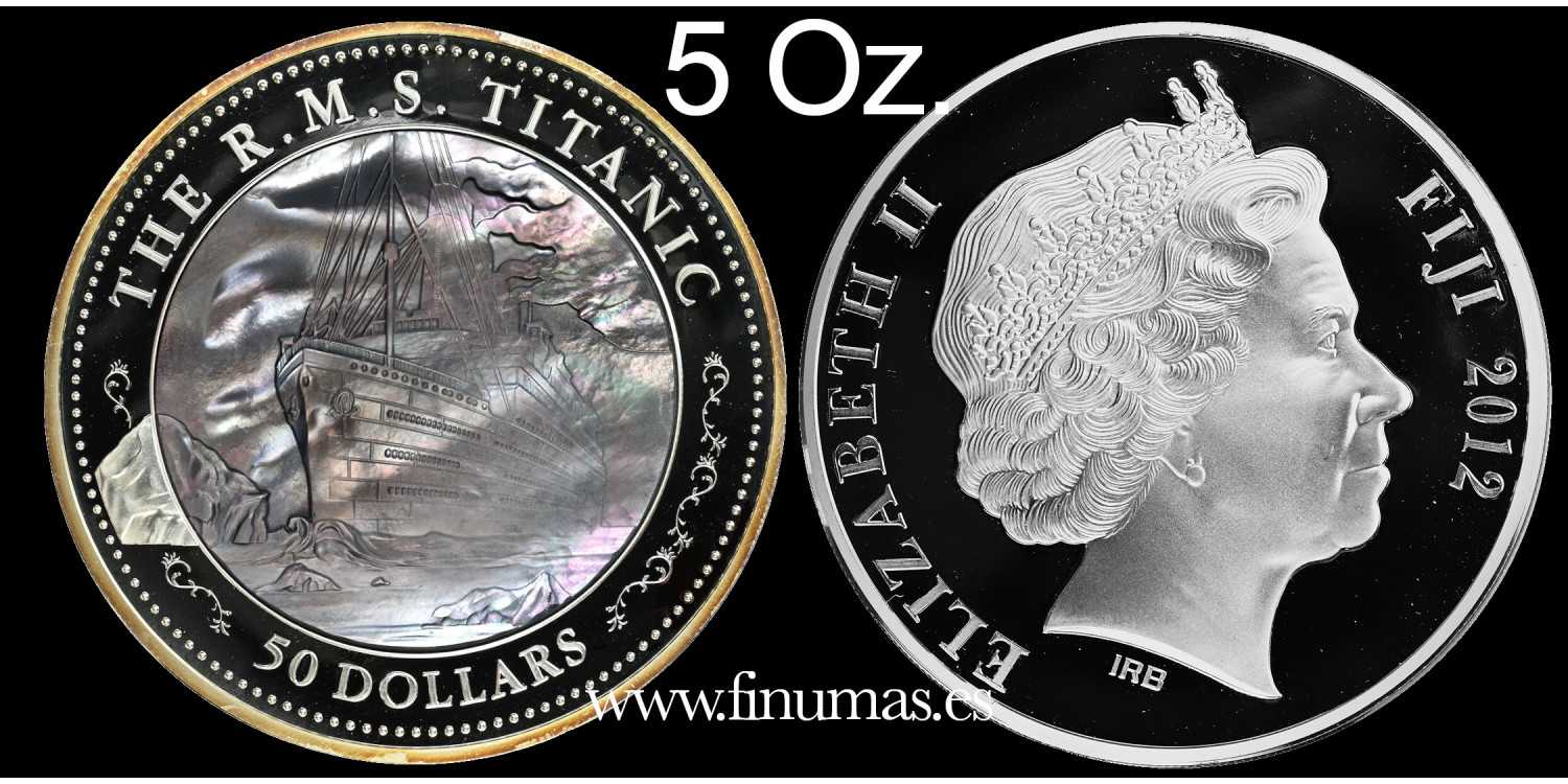 50 Dollar Fiji Islands 2012 Limited mintage to 750 coins worldwide. 5 oz (155.55gm) of .999 fine silver. ø65mm. Genuine mother-of-pearl inner core.