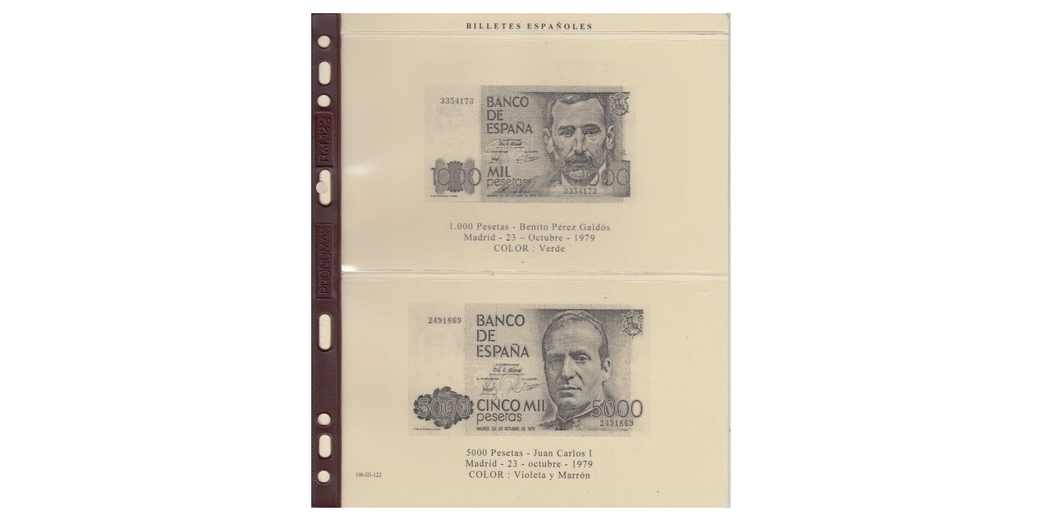 Album with 6 sheets prepared to contain the banknotes issued during the reign of Juan Carlos I (value in pesetas). Each sheet is printed with a b/w reproduction of the banknote, the title, description, date of issue and colour of each banknote.
