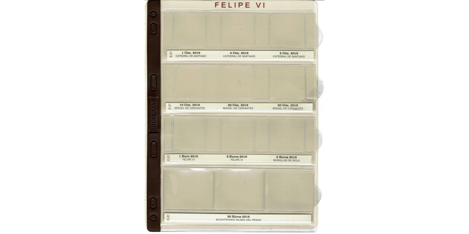 Specific sheet of the brand PRONUMAS to accommodate the 9 Euro pieces minted in 2018 + 30€ minted under the reign of FELIPE VI . Reinforced spine.
