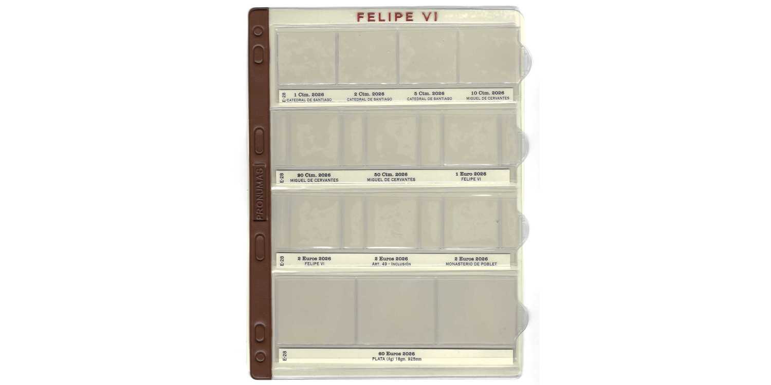 Specific sheet of the brand PRONUMAS to hold the 9 Euro coins minted in 2025, plus the 40€ coin, minted under the reign of FELIPE VI . Reinforced spine.