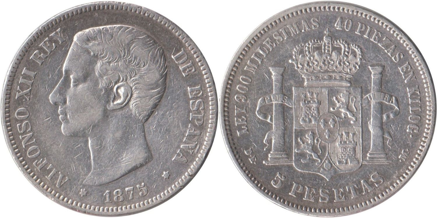 5 Pesetas 1875 (18-75) DEM - Grated earflare variant