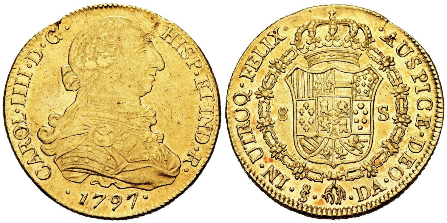 gold 0Onza (26'94 gr. AU).-Year:1797. Assayers: D.A Mint: Santiago, Chile. Ordinal IIII. Almost uncirculated piece. Minimal leaves and some minting flaws on the edge. Original full brightness. Lovely reverse