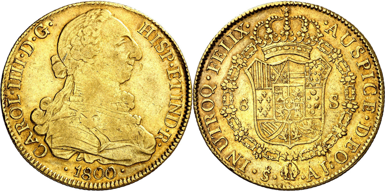 Gold ounce (26'89 gr. AU) -Year:1800 J.A. Santiago de Chile. Ordinal IIII. Bust Charles III. Excellent Good Condition. Great part of original luster. EBC