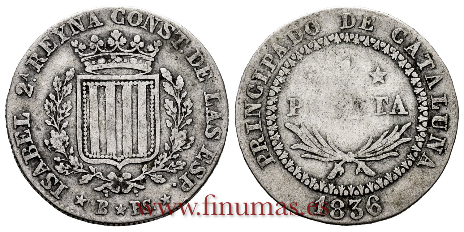 Cy16073.-ISABEL II - 1 Peseta 1836 Barcelona B*PS- Striated Edge. BC