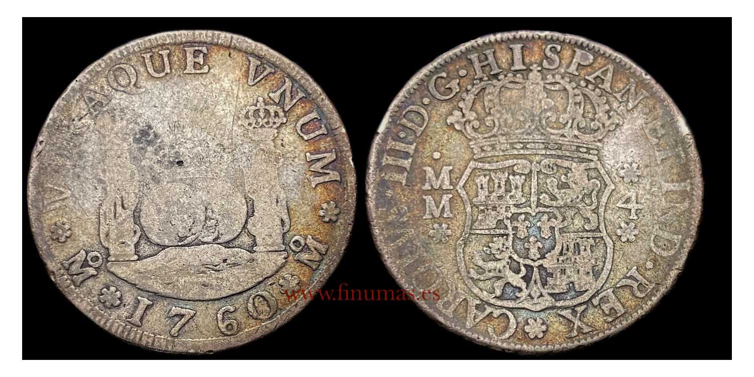 CHARLES III. 4 reales. Mexico. 1760. MM. Aplatanarás (Ag) 12,73 g. ø33 mm. Nice Monetary patina. BC+/BC-. Very scarce.