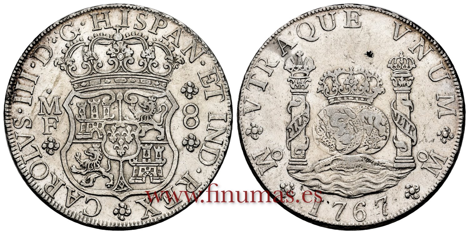 Carlos III. 8 reales. 1767. México. MF. (Cal-1092). Ag. 26,91 g. Pequeño Resello chino sobre corona. Restos de brillo original. EBC-