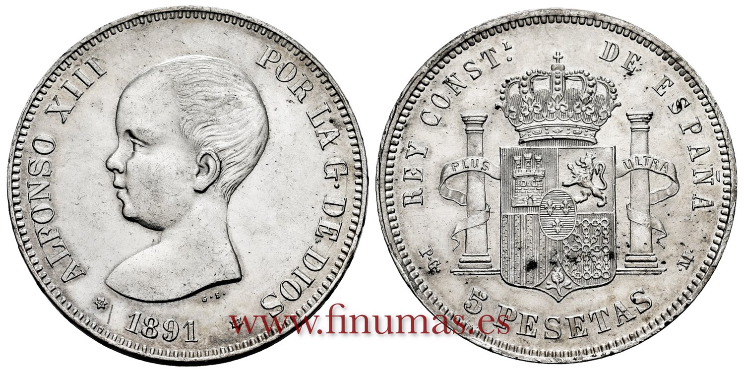 Cy16698H.- ALFONSO XIII 5 Pesetas 1891 (18-91) PGM - EBC