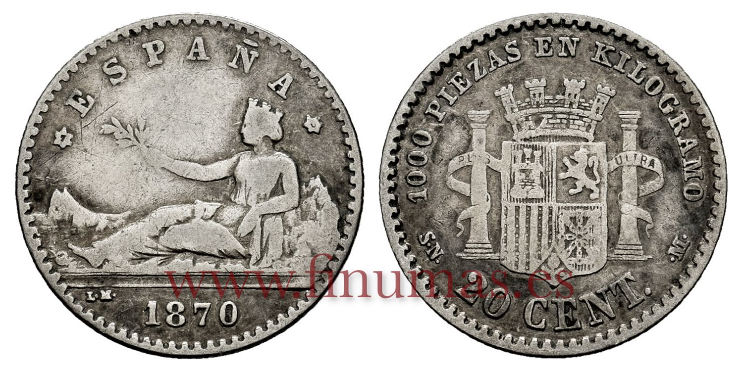 Gobierno Provisional (1868-1871). 20 céntimos. 1870*7-0. Madrid. SNM. (Cal-12). Ag. 0´99g. BC+/Mbc-