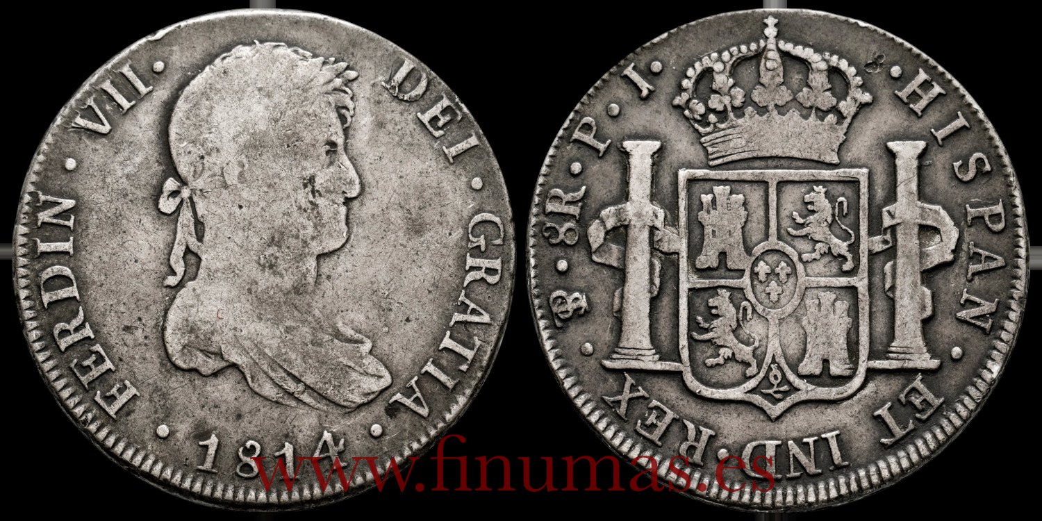 Fernando VII 8 reales 1814 Potosí PJ. Plata (Ag.) 26,75 g. Pátina. MBC- (Cal-1378).