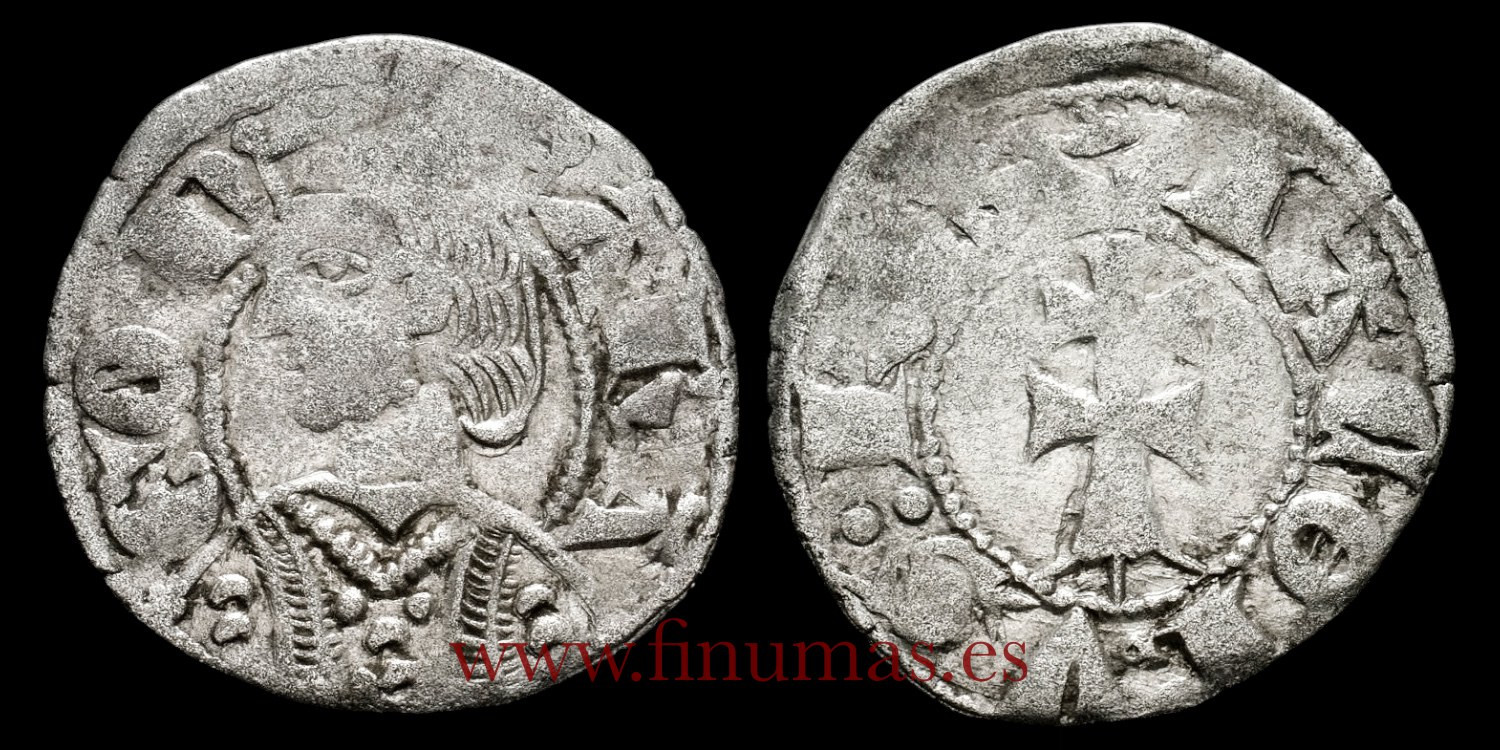 Money Jaques Vellon 19 mm. 0,8 gm. Obverse: King crowned left. ARAGON. Reverse: Cross with double crossbeam. IACOBVS REX