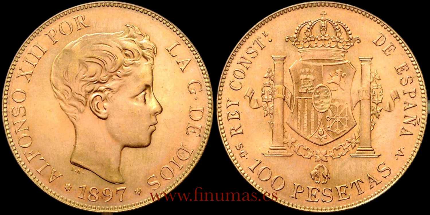Official re-circulation of the 100 pesetas of 1897 Stars 19 - 61. Assayers SG V. Great part of original lustre .Gold (Au) 32'26gm. Uncirculated