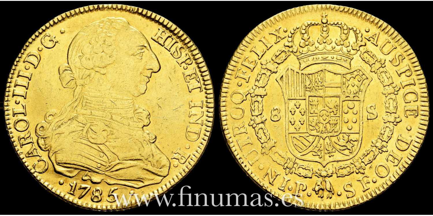 Charles III 8 escudos 1785. Popayan S.F. Gold (Au) 26,76. Obverse with traces of lustre and some small marks, beautiful reverse practically SC.MBC/MBC+(Cal-2020)