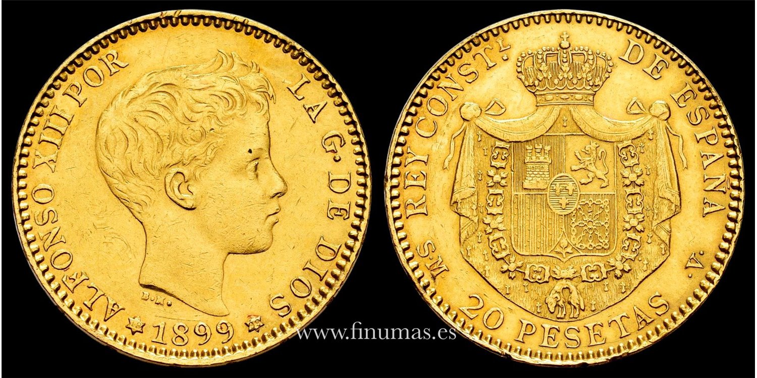 Alfonso XIII. 20 Pesetas. Madrid. 1899. Ensayador MP·M. Oro (Au) 6,44g. Marquitas. MBC+ (Cal-116.)