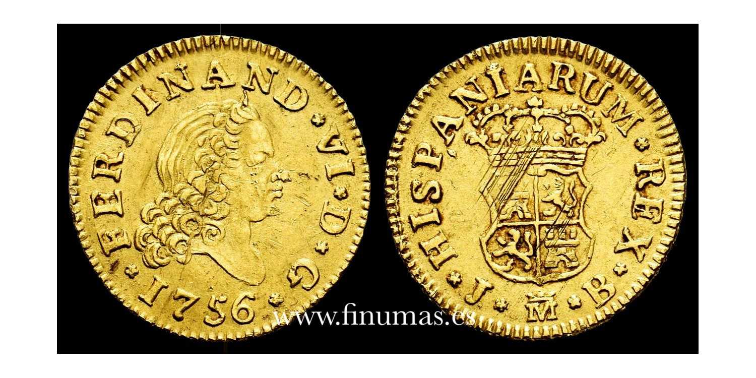 Fernando Vi 1/2 Escudo 1756 Madrid J.B. Type I. Gold (Au) 1,76gm. Weight adjustment lines on the reverse and small marks on the obverse. Much more attractive in hand. MBC
