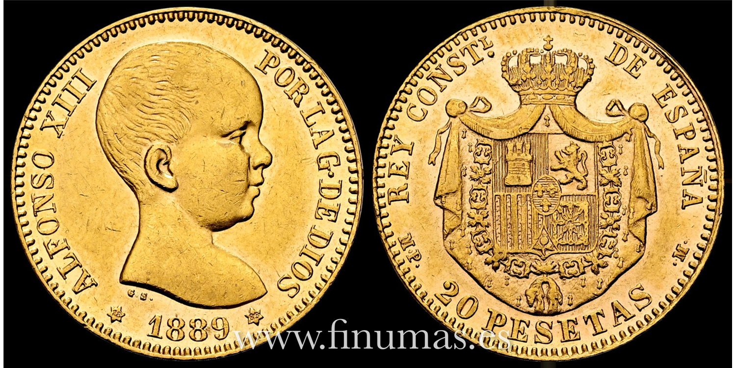 ALFONSO XIII 20 pesetas 1889 (18*89) MPM. Oro (Au) 6,46gm. Alguna marquita en gráfila y gran parte de brillo original. SC- (Cal.113)