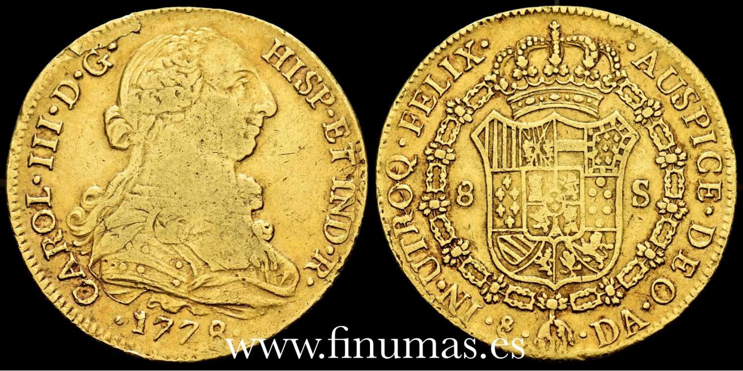 Charles III 8 escudos. 1778. Santiago. DA. Gold (Au.) 26'98gm. BC+/MBC- (Cal-2156)