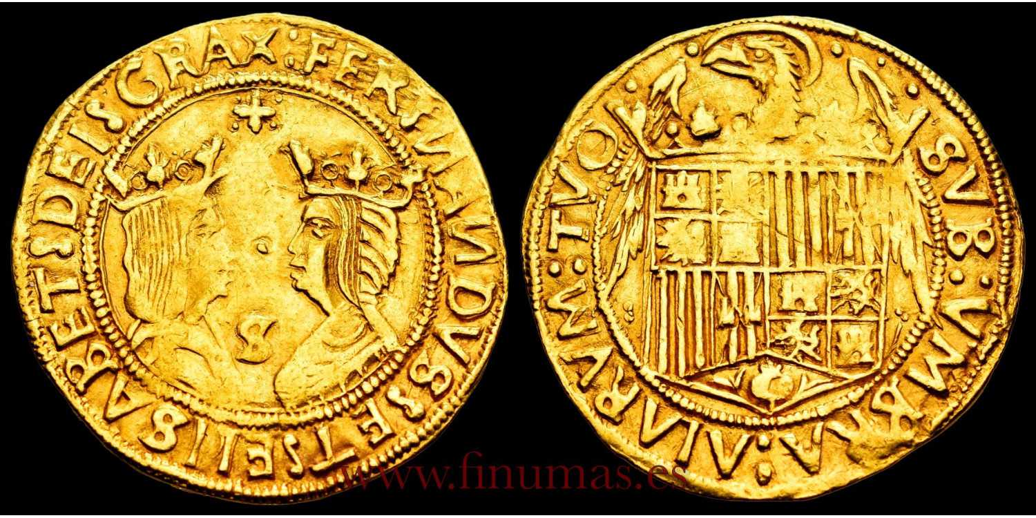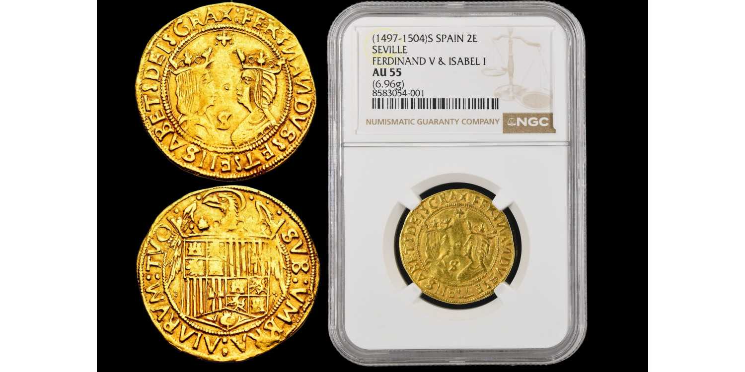 Ferdinand and Isabella. Double excellent Seville N/D (1497 -). Obverse: + FERNSNDVS :ET : ELISABET : DEI : GRAX. Rev.: SVB : VNBRA : ALARVM : TVO. Gold (Au.) 6,96 g. Cross flanked by dots above and S below, between the busts. EBC. Encapsulated and graded by NGC as NGC55