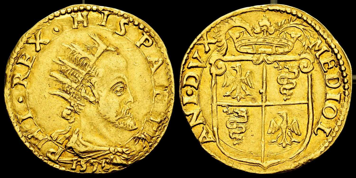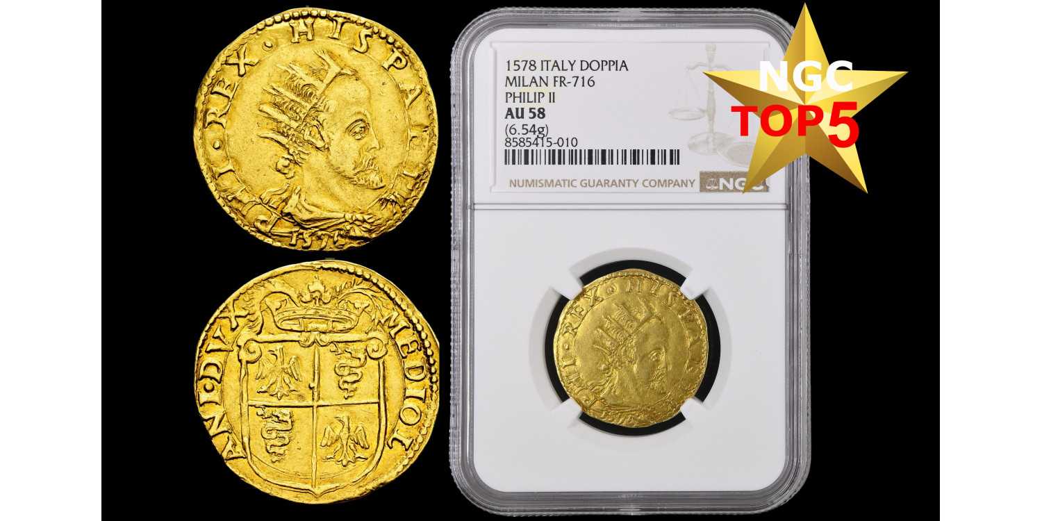 Philip II 1 Doppia 1578 Milan. Gold ( Au.) 6,54 g. Nice colour and slight traces of lustre. Rare and more in this condition. NGC AU58. TOP5. Only 4 pieces better preserved in the NGC census. EBC+/SC- (Tauler-323). (Fr-716) (Mir-Mil 301/12)