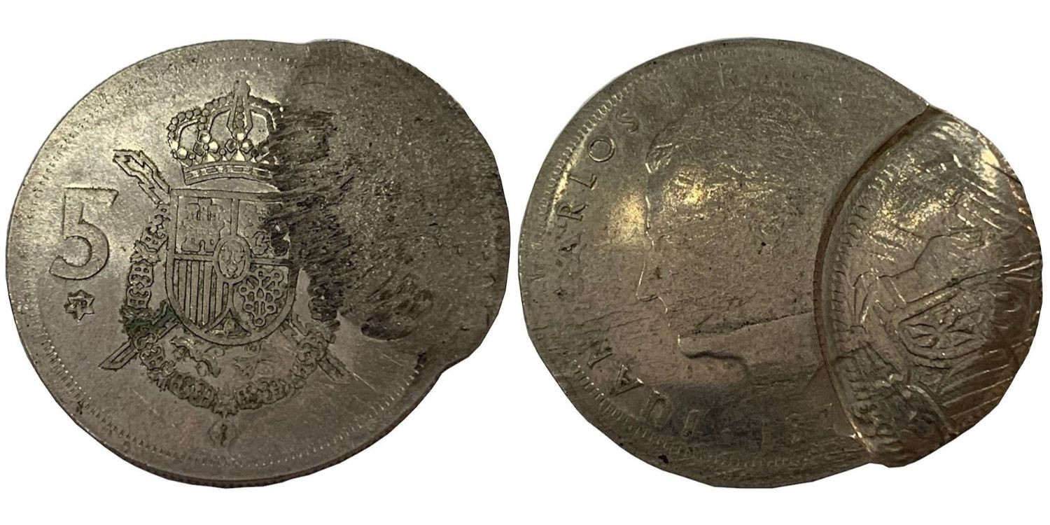 5 pesetas 1975 *79 with double reverse mint. Very displaced.