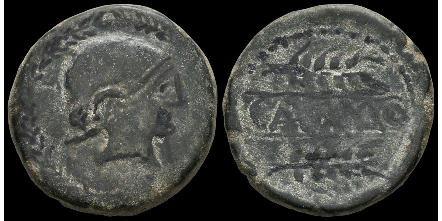 CARMO (Carmona, Sevilla). As. Bronce (Ae.) 26,41g. Anv: Cabeza masculina con casco a derecha, alrededor corona de laurel. Rev: Dos espigas a derecha, entre ellas leyenda: CARMO. MBC