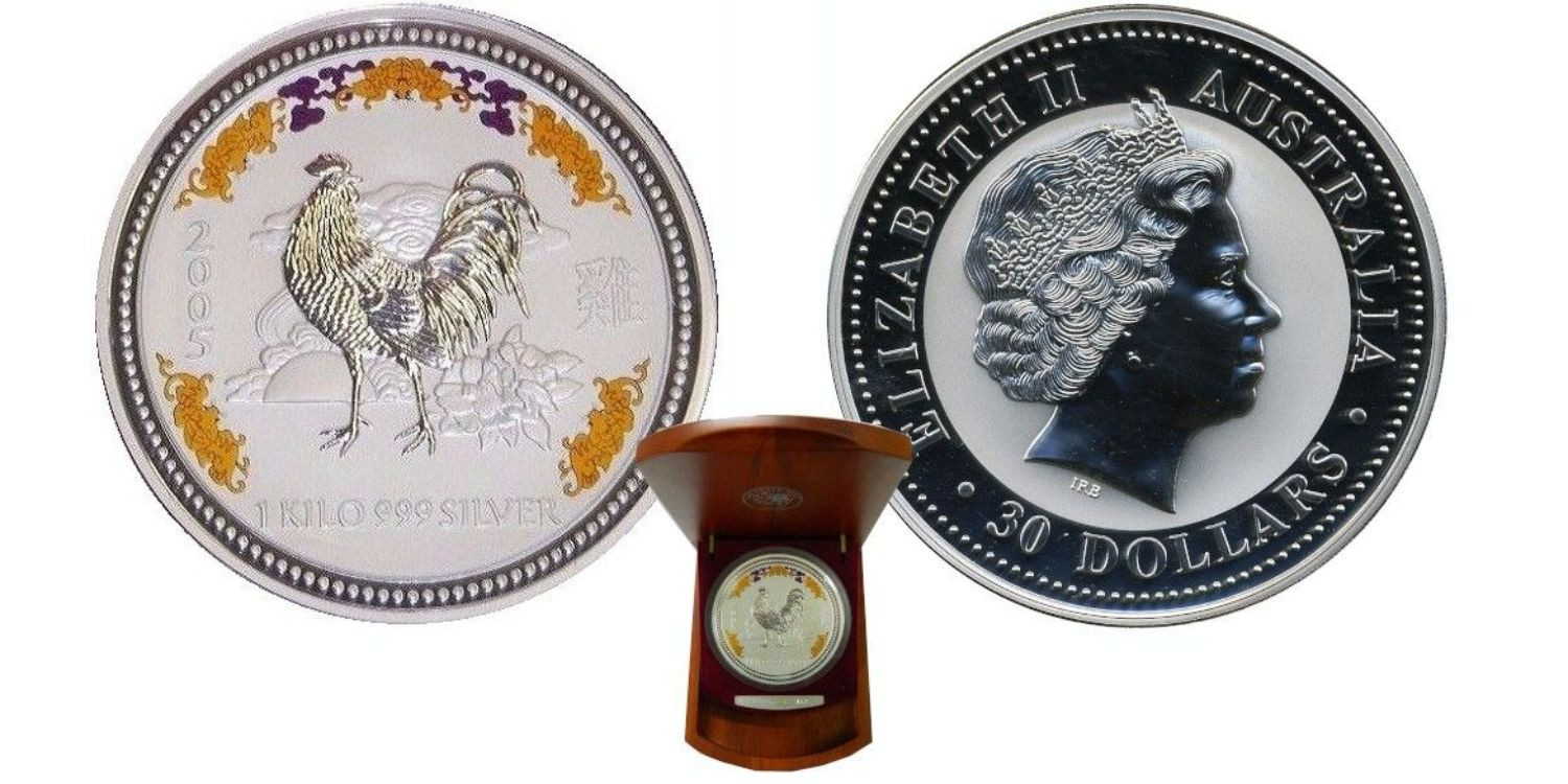 Australian coin of the year 2005. Lunar year of the rooster. Colour coin. The rooster's eye is a diamond of 0,02 Ct. delivered with case, capsule and original certificate. Rooster with diamond eye.
