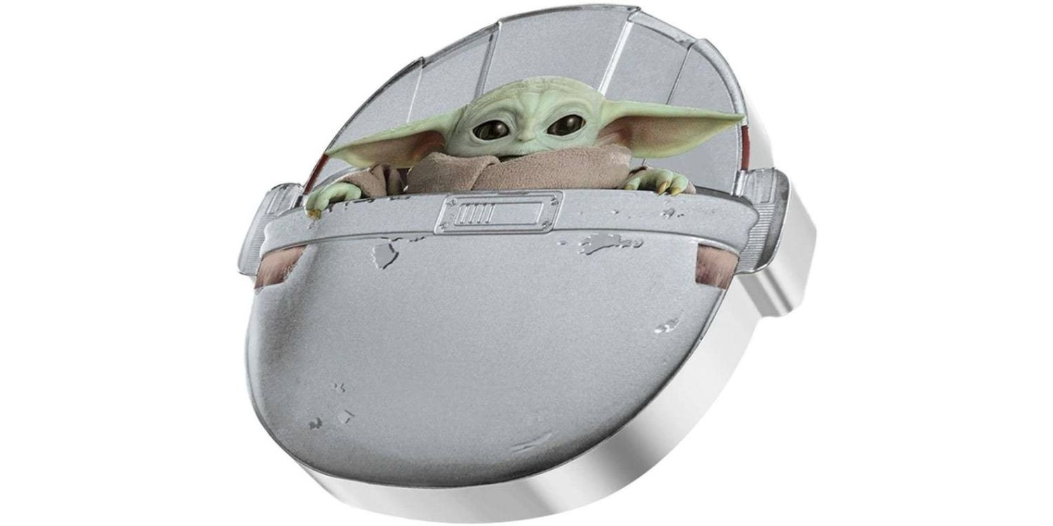 2 dollars Baby Yoda 2022. The coin depicts Grogu (Baby Yoda) in full colour, sitting innocently in his floating pram.