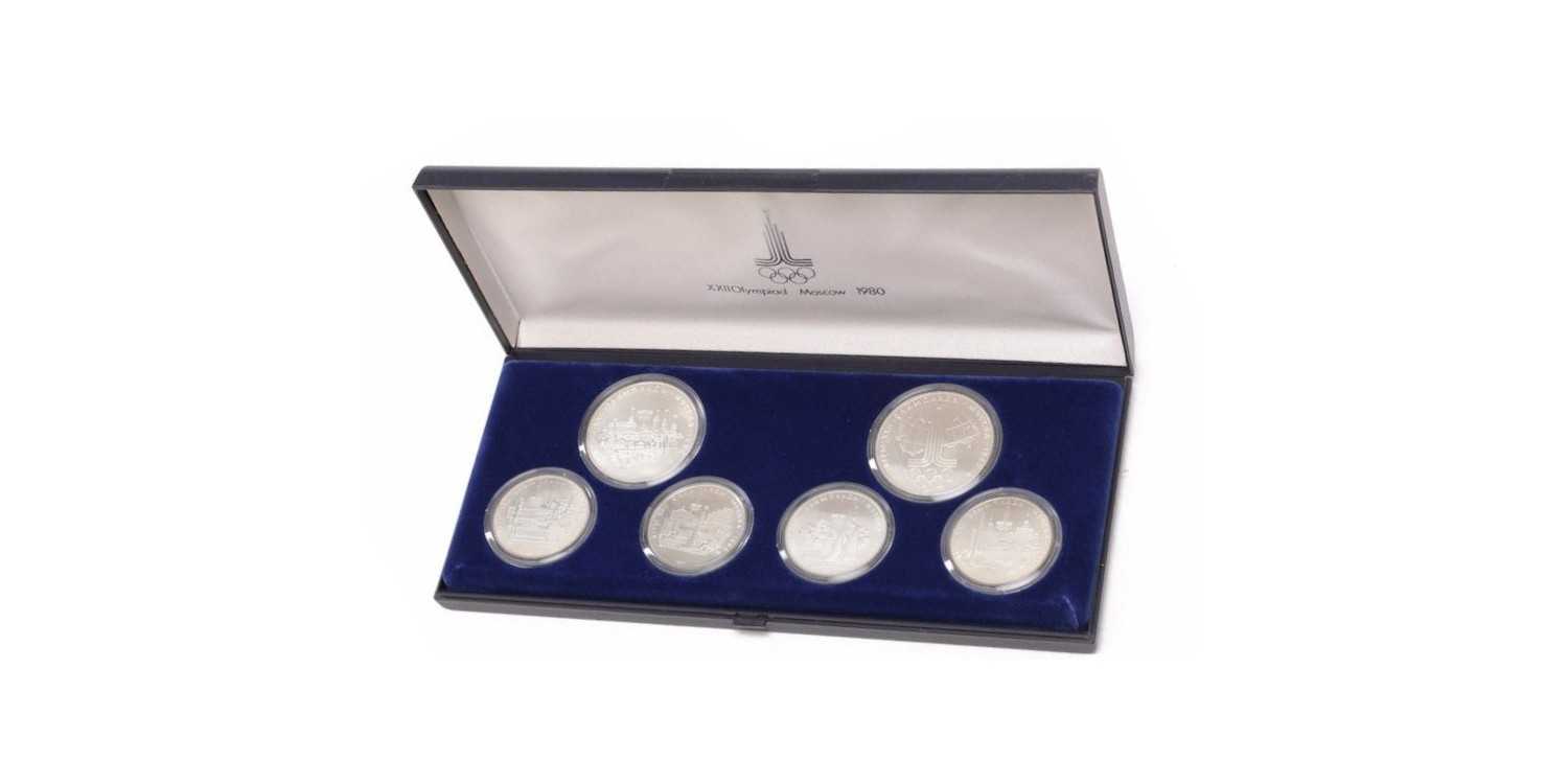 Official box of 6 silver coins of 1977. Commemorating the 1980 Moscow Olympiad. 4 x 5 rouble coins: 33 mm diameter, weight, 0.5359 troy oz. (16,67 gr.) 2 x 10 rouble coins: 39 mm diameter, weight, 1,071 troy oz.(33,31 gr.)