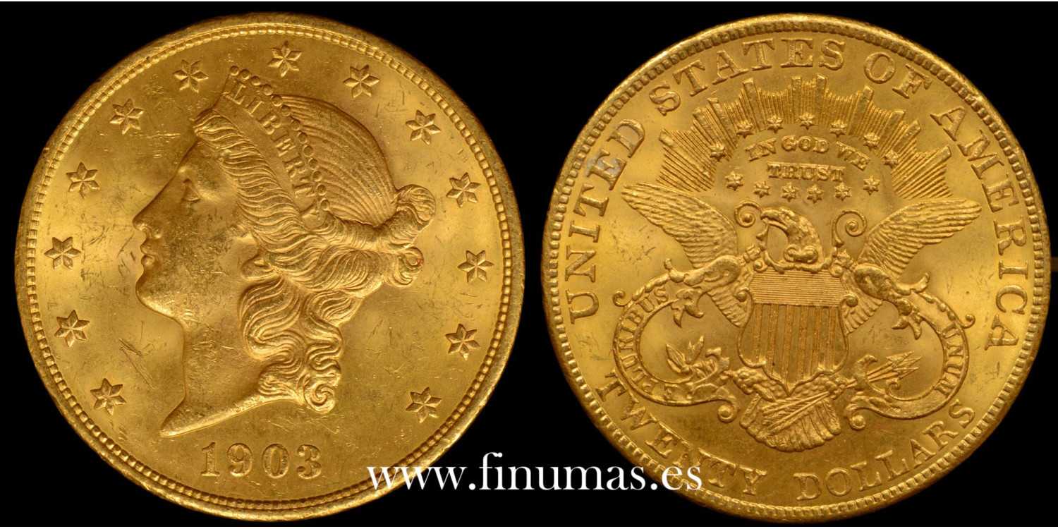 20 US dollar. 1903 PHILADELPHIA. Coronet head - Double Eagle Gold. Gold(Au) 33'43gm .900mm Ø34mm. EBC/EBC+
