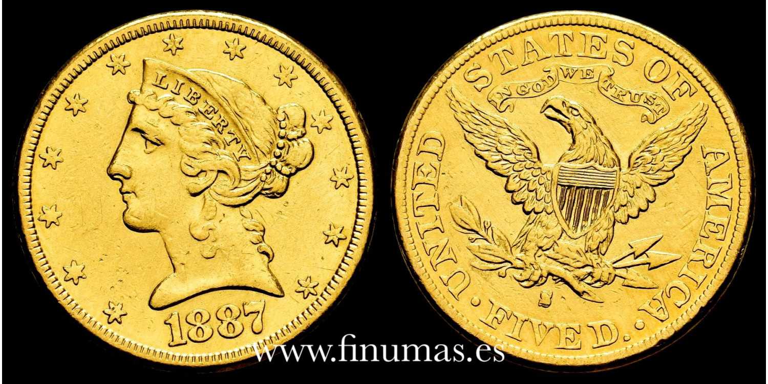 5 dollar USA. 1887 San Francisco. Coronet Head - Half eagle. Gold(Au) 8,35g .900mm Ø21'6mm. Slightly polished. Mbc