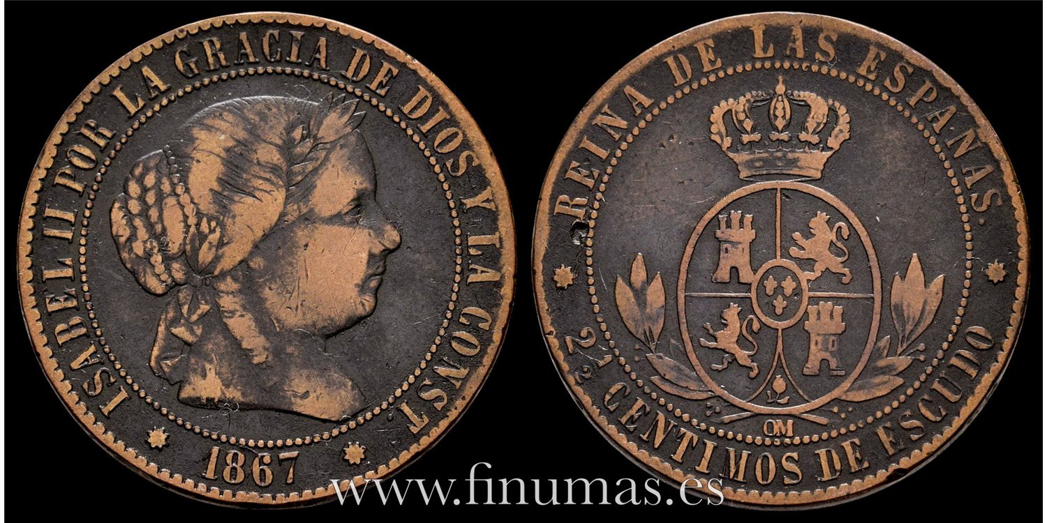 Cy15796.- ISABEL II - 2 1/2 Centimo de escudo 1867 Sevilla OM- BC