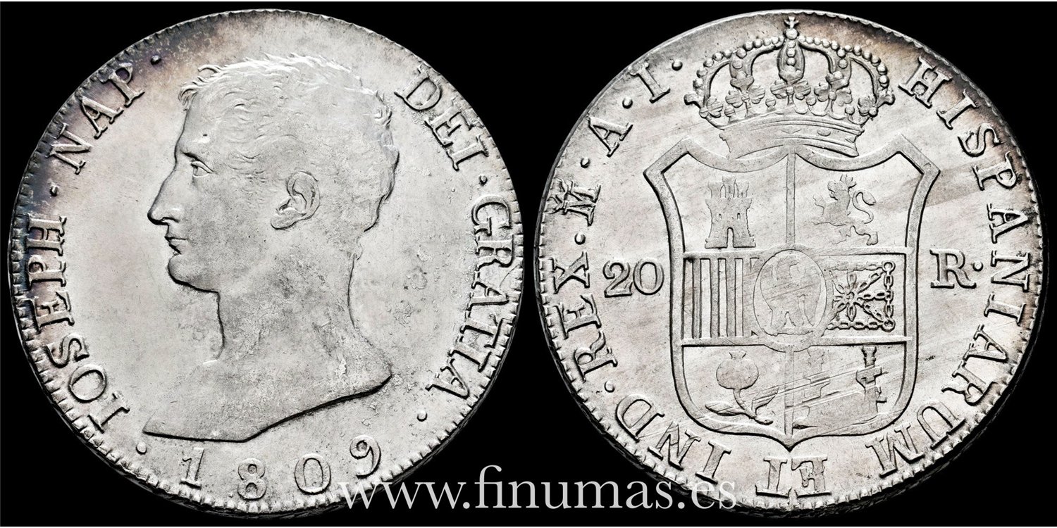 José Napoleón 20 reales 1809 Madrid AI. Plata (Ag.) 27,19 g. Águila grande. Grandes zonas de Brillo Original. Acuñacion algo floja. EBC (Cal-37).