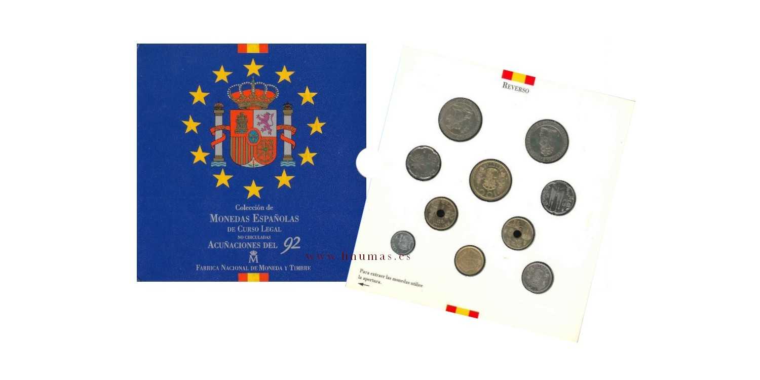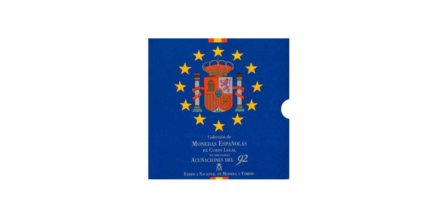 Carterita oficial d3 la FNMT que incluye las monedas en pesetas circulantes del año 1992, acuñadas de manera artesanal, con cospeles y troqueles especialmente tratados para obtener la máxima calidad.