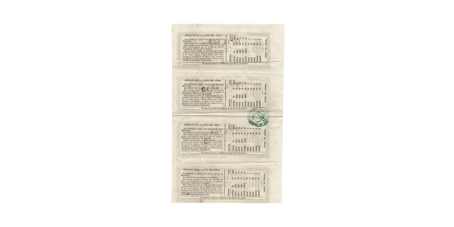 Real Lotería , Tira de 4 Octava parte sorteo en Madrid el día 8 de NOVIEMBRE DE 1860, excelentemente bien conservado- vale de quince reales de vellón