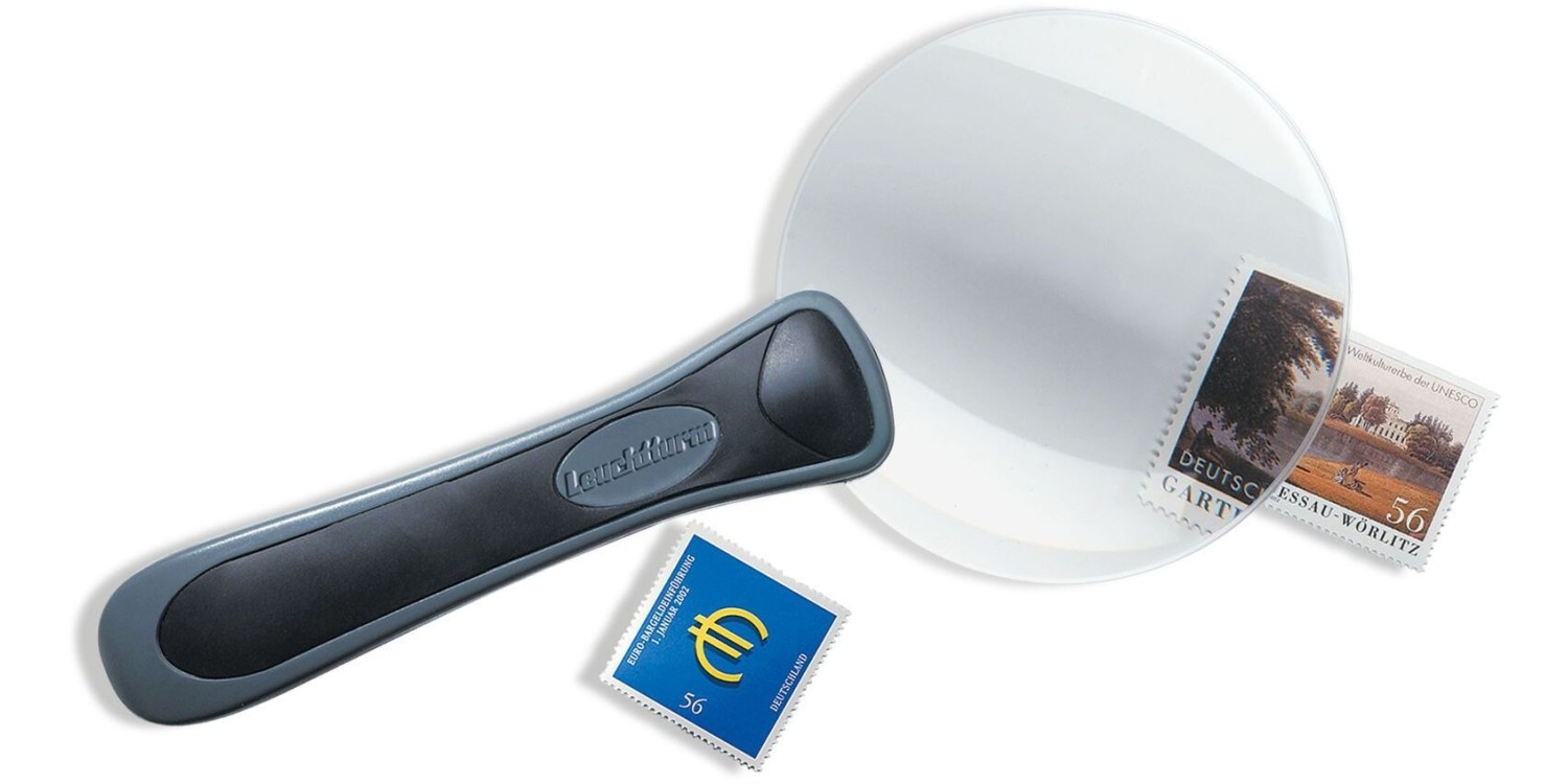 LEUCHTTURM Lupa luminosa inoxidable Led. Ideal para espacios con poca luz. Lente acrílica de alta calidad, mango ergonómico metálico. Diseño moderno. Excelente calidad óptica. Diámetro de la lente 75mm. 2.5 aumentos. 2 LED.