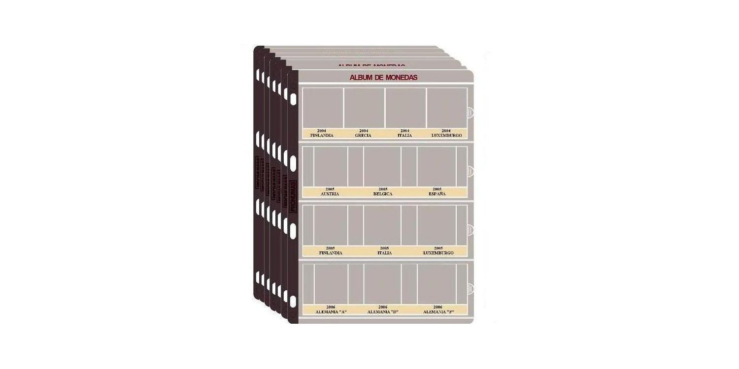 Juego de 7 hojas diseñado para contener todas las monedas de 2 € conmemorativas emitidas por los distintos países de la zona Euro desde 2004 hasta 2010. Posteriormente permitirá actualizar la colección con hojas anuales