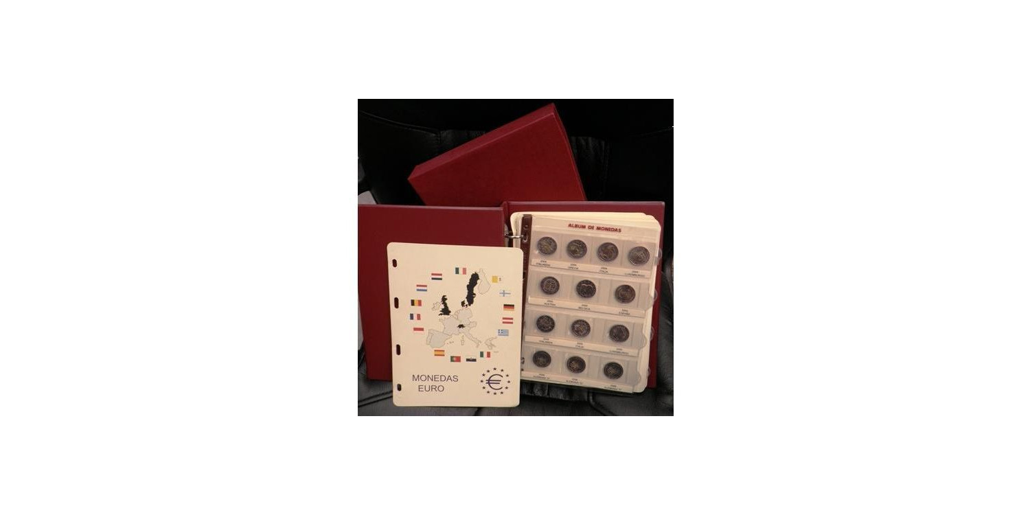 Juego de tapa y cajetin mas 7 hojas diseñado para contener en un solo album todas las monedas de 2 euro conmemorativas emitidas por los distintos países de la zona Euro desde 2004 hasta 2010. Permite ir actualizando la colección con hojas anuales No incluye monedas