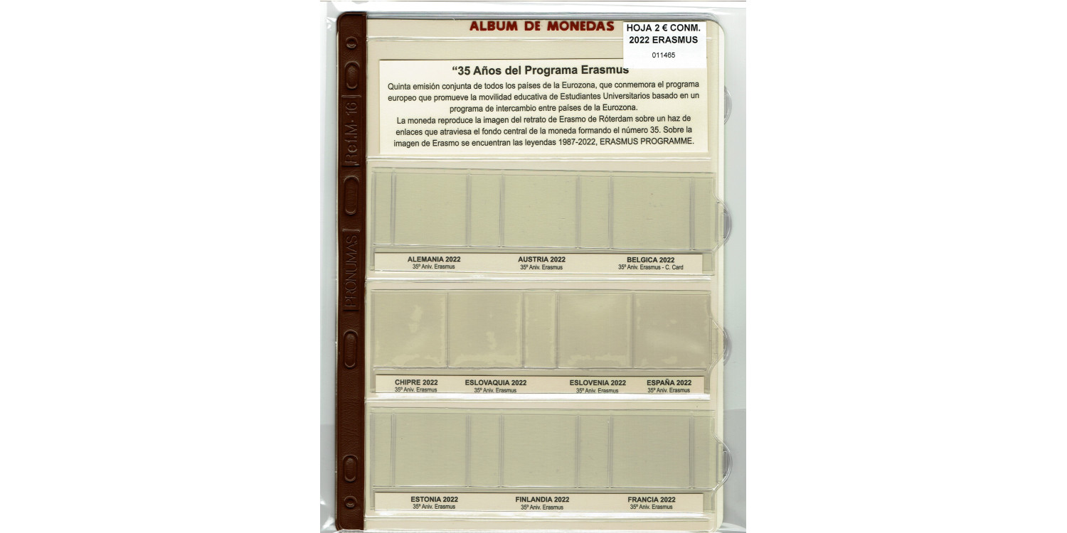 Juego de 2 hojas diseñadas para contener todas las monedas de 2 euro conmemorativas 2022 serie común "ERASMUS" emitidas por los distintos países de la zona Euro, incluidas las 5 cecas de Alemania y las presentadas originalmente en Coincard