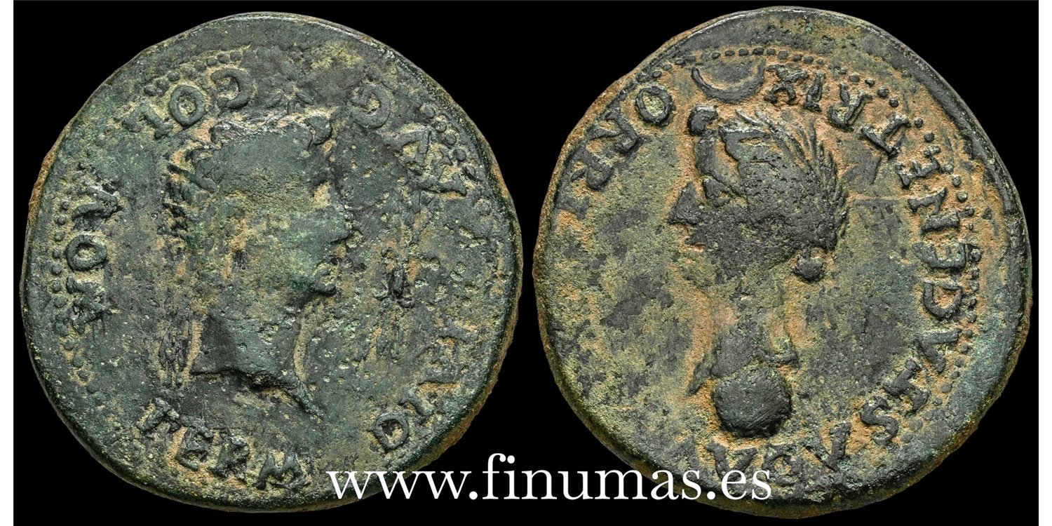 Colonia Rómula. Época de Tiberio. Dupondio. 14-36 d.C. Sevilla. (Abh-2014). (Acip-3360). Anv.: Cabeza radiada de Augusto a derecha, delante fulmen, alrededor PERM. DIVI. AVG. COL. ROM. Rev.: Cabeza de Livia a izquierda, debajo globo, encima creciente, alrededor (IVLIA). AVGVSTA. GENETRIX. ORBI(S). Ae. 24,34 g. MBC-.