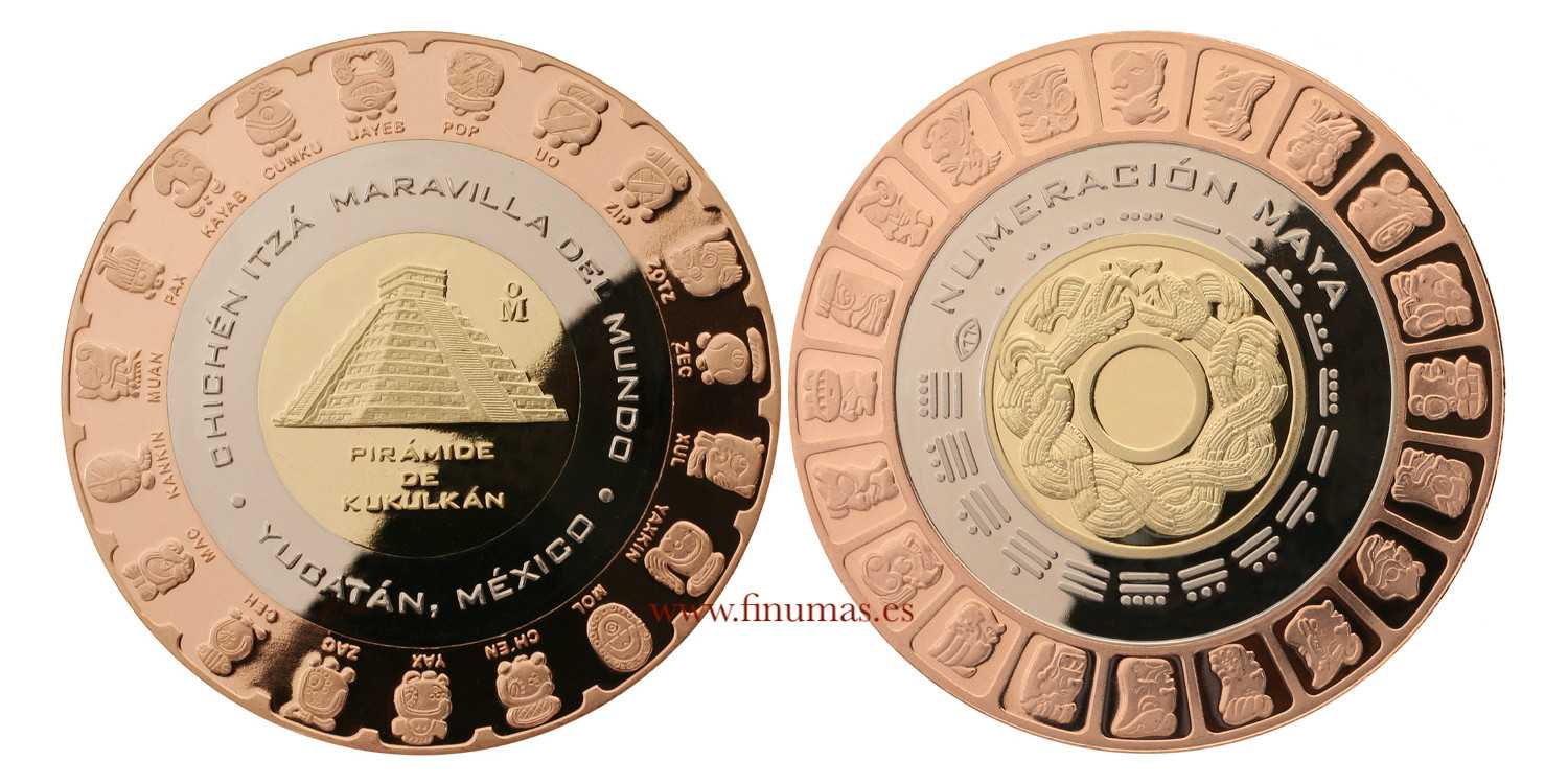 Como un homenaje a la cultura maya, la Casa de Moneda de México, acuñó una medalla conmemorativas que ilustra. el legado de la cultura maya. La histórica construcción maya de la Pirámide de Kukulcán se puede observar en el anverso de la medalla, así como los meses del año maya, acompañado del texto: Chichén Itzá, maravilla del mundo, Yucatán, México. Pirámide de Kukulkán. Se trata de una medalla de 50 mm en latón de una aleaciones de Cu-Ni (cobre-níquel), con un peso de 52.304 gramos, en acabado proof
