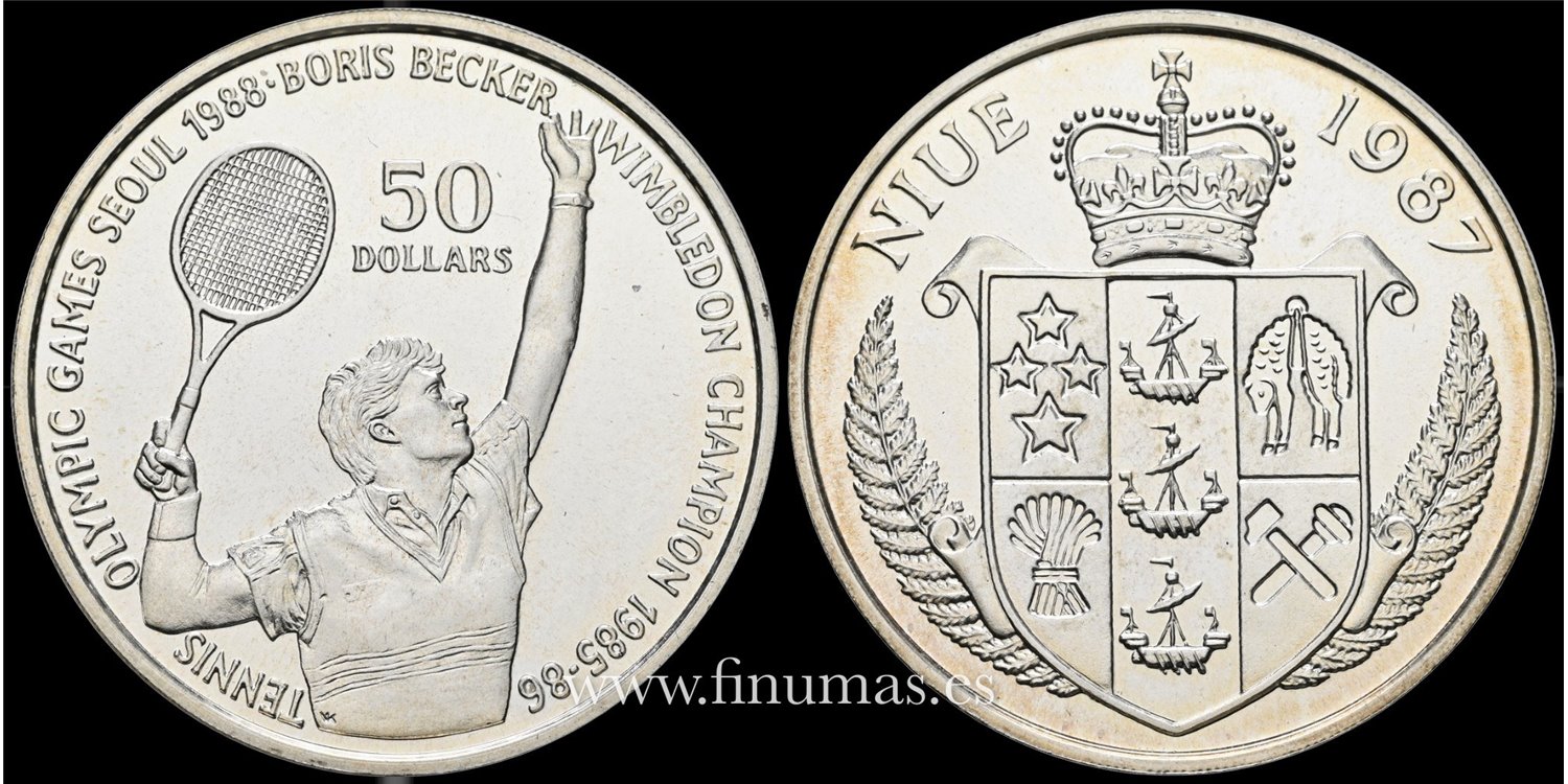Niue 50 dólares 1987. Juegos Olímpicos. Seúl 1988. Tenis. Boris Bécker Plata (Ag.) 27,57 g. Proof.