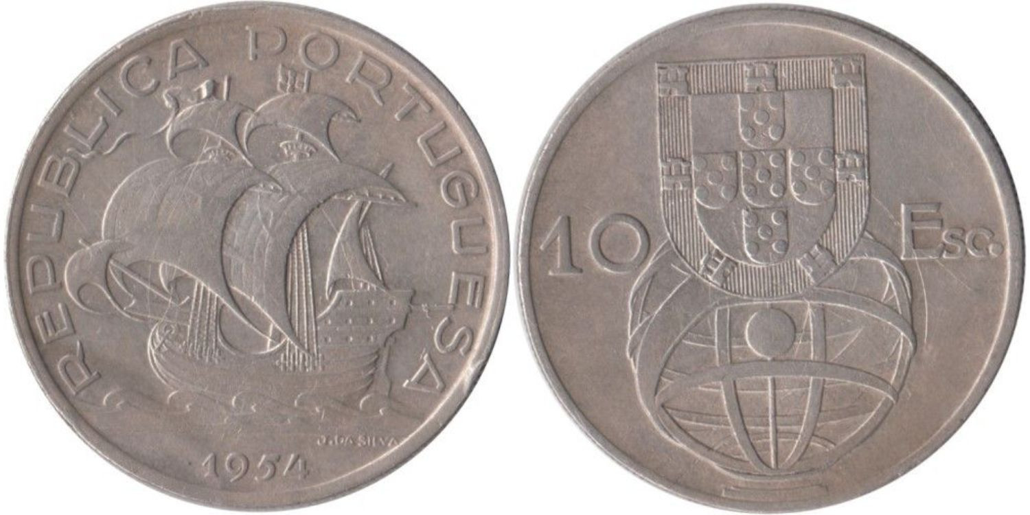 PORTUGAL - K-586 - 10 ESCUDOS 1954 ,MBC plata