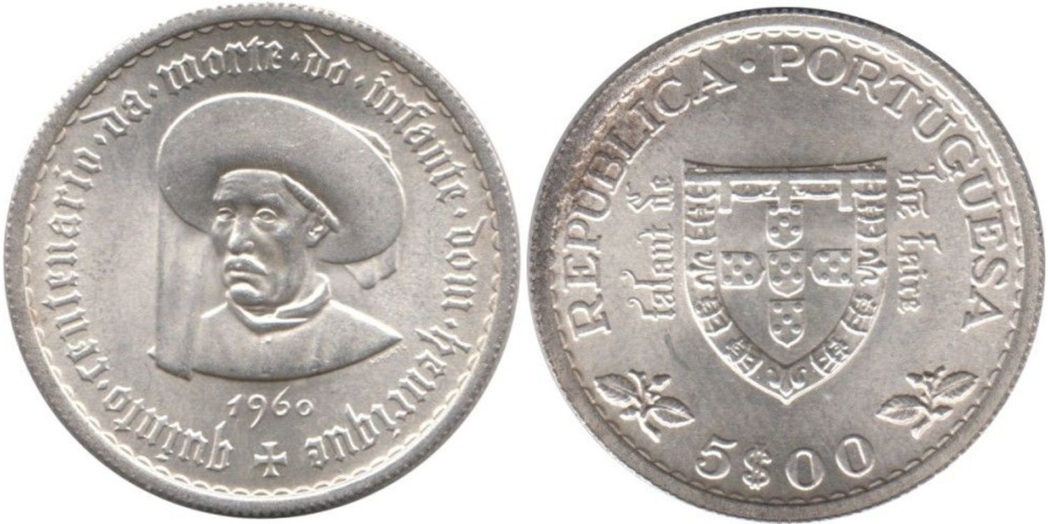 PORTUGAL - K-587 - 5 ESCUDOS 1960 ,SC plata