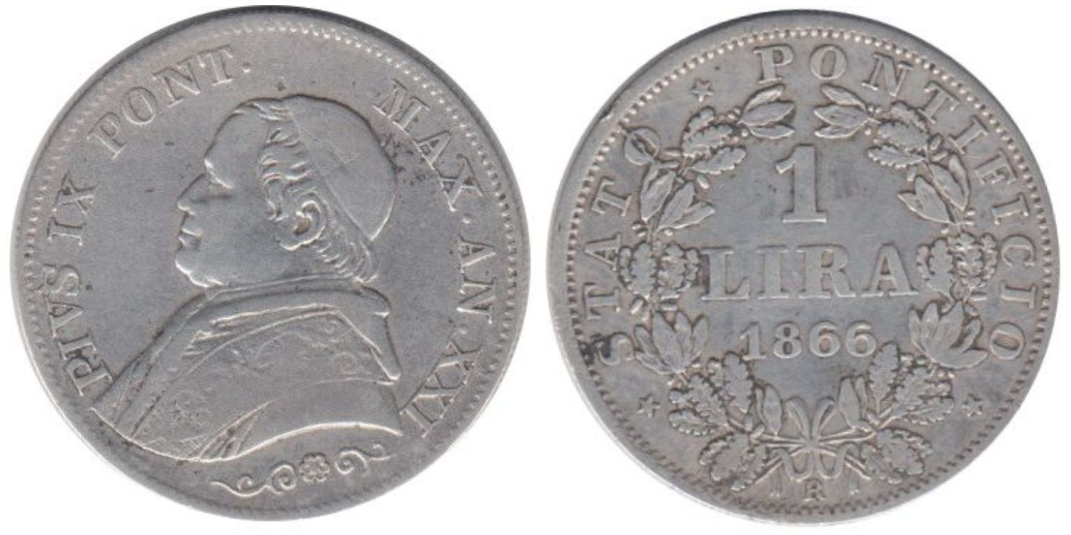 VATICANO - C-1377.2 - 1 LIRA 1866 , BC+ plata
