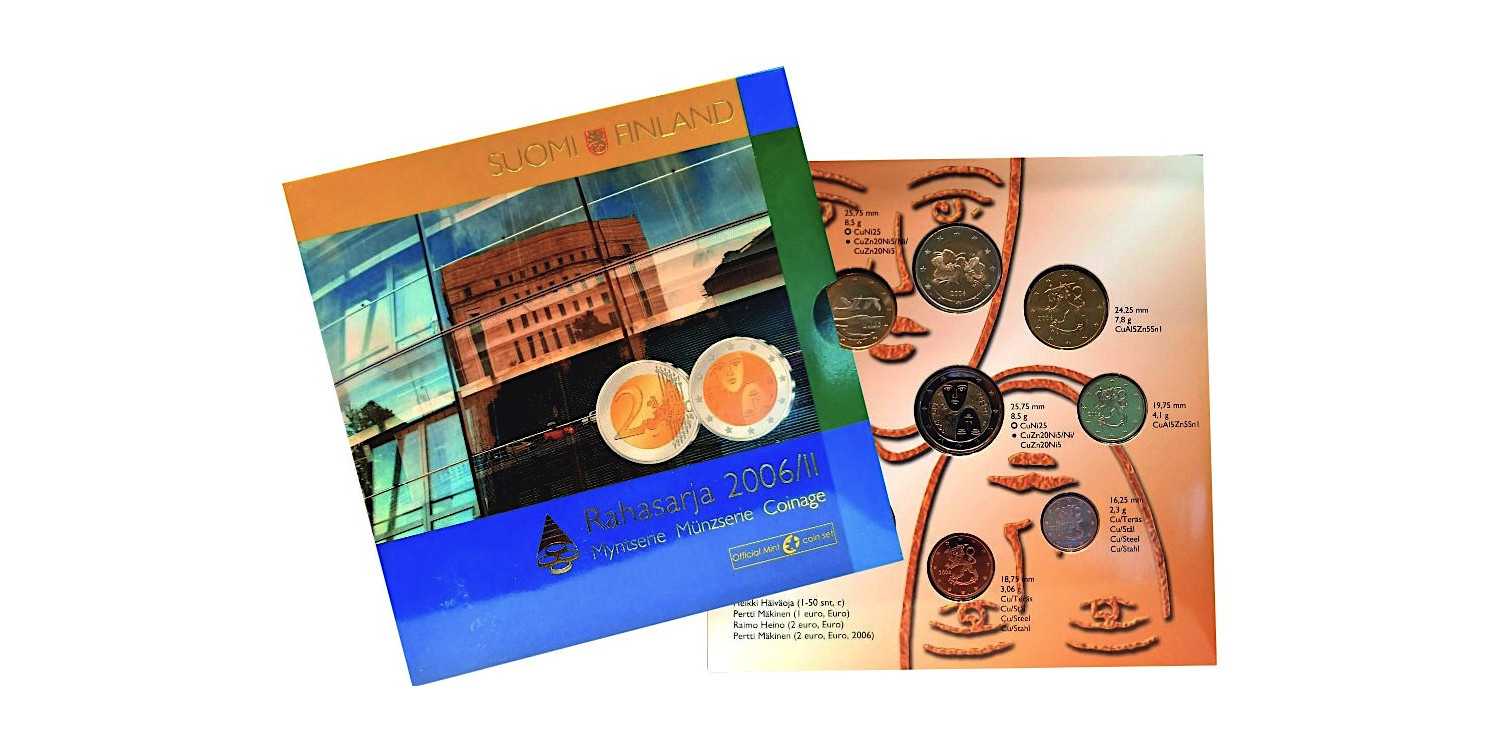 Set oficial de Finlandia que incluye los 8 valores acuñados en el año 2006 + moneda 2 € conmemorativos